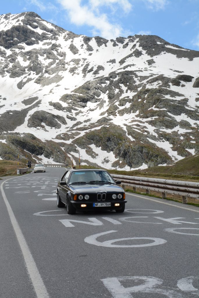 Aufbruch Samstagabend in Husum. Circa 1.300 Kilometer bis Norditalien. Werner tankte den ehemaligen bayerischen Flaggschiff-Sechszylinder voll und fuhr in die Nacht. Treffpunkt mit Marc am Sonntagvormittag: Raststätte Allgäuer Tor. Hat geklappt. Und wer je zu zweit in passenden Autos über die Alpen gerollt ist, weiß: Anfahrten können wunderschön sein.